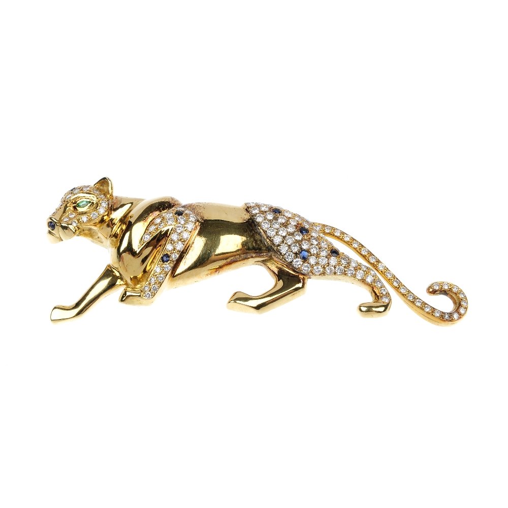 A diamond, emerald and sapphire leopard brooch.