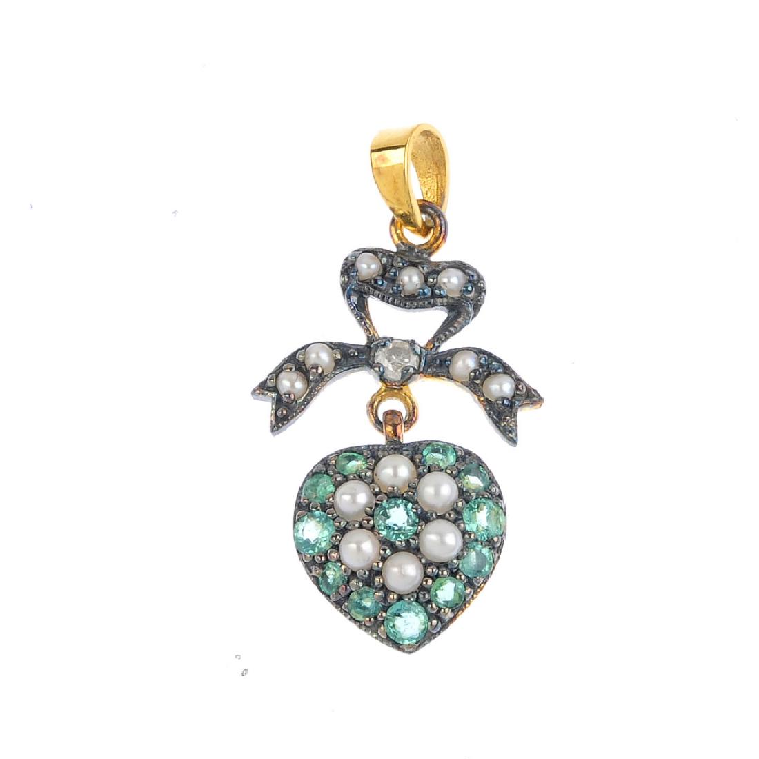 A diamond, emerald and split pearl pendant. The