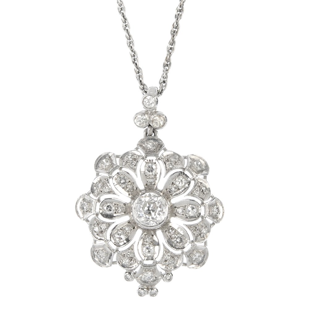 A diamond floral pendant.
