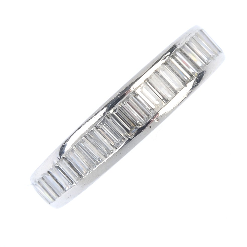 SoldA platinum diamond half eternity ring. The baguette-cutA platinum diamond half eternity ring. The baguette-cut diamond line, within a channel setting, to the tapered band. Estimated total diamond weight 1.35cts. Hallmarks for London, 2006. Ring size K1/2.See Sold Price
