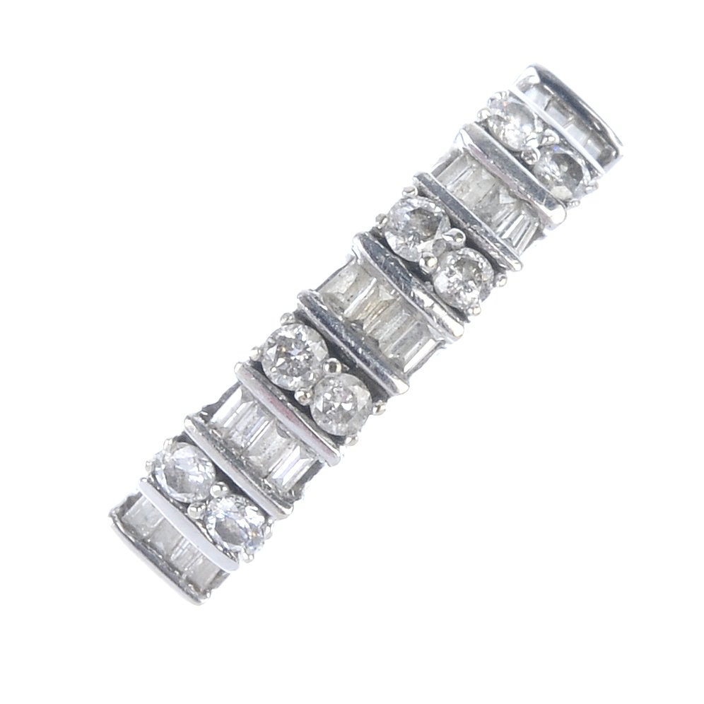 SoldA platinum diamond half eternity ring. Designed as aA platinum diamond half eternity ring. Designed as a series of brilliant and baguette-cut diamond lines, with bar spacers and plain half-band. Estimated total diamond weight 0.75ct. Hallmarks for LondSee Sold Price