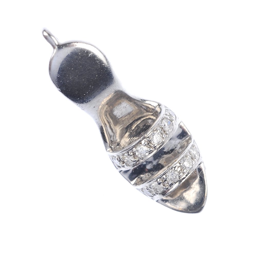 SoldA diamond novelty pendant, with chain.A diamond novelty pendant. Designed as a shoe, with pave-set diamond strap. Length of pendant 1.8cms. Length of chain 48cms. Weight 6.5gms.See Sold Price