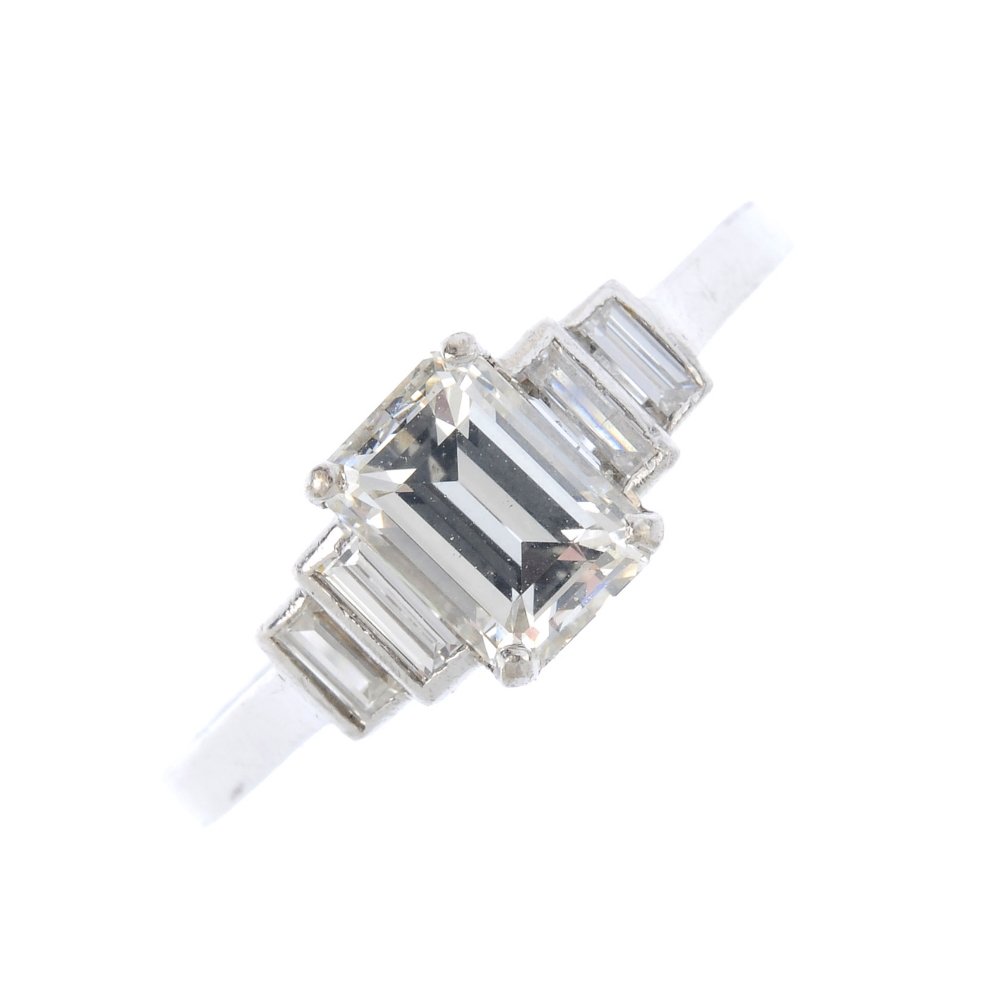 A diamond ring. The rectangular-shape diamond, with