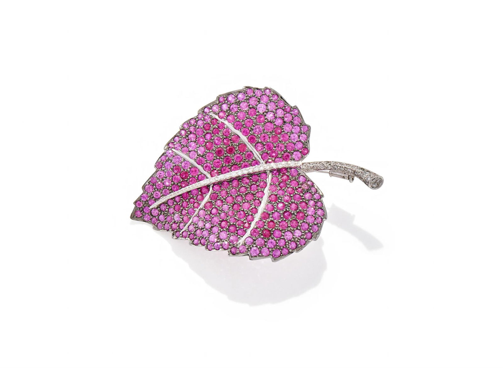 A DIAMOND, RUBY AND PINK SAPPHIRE LEAF BROOCH