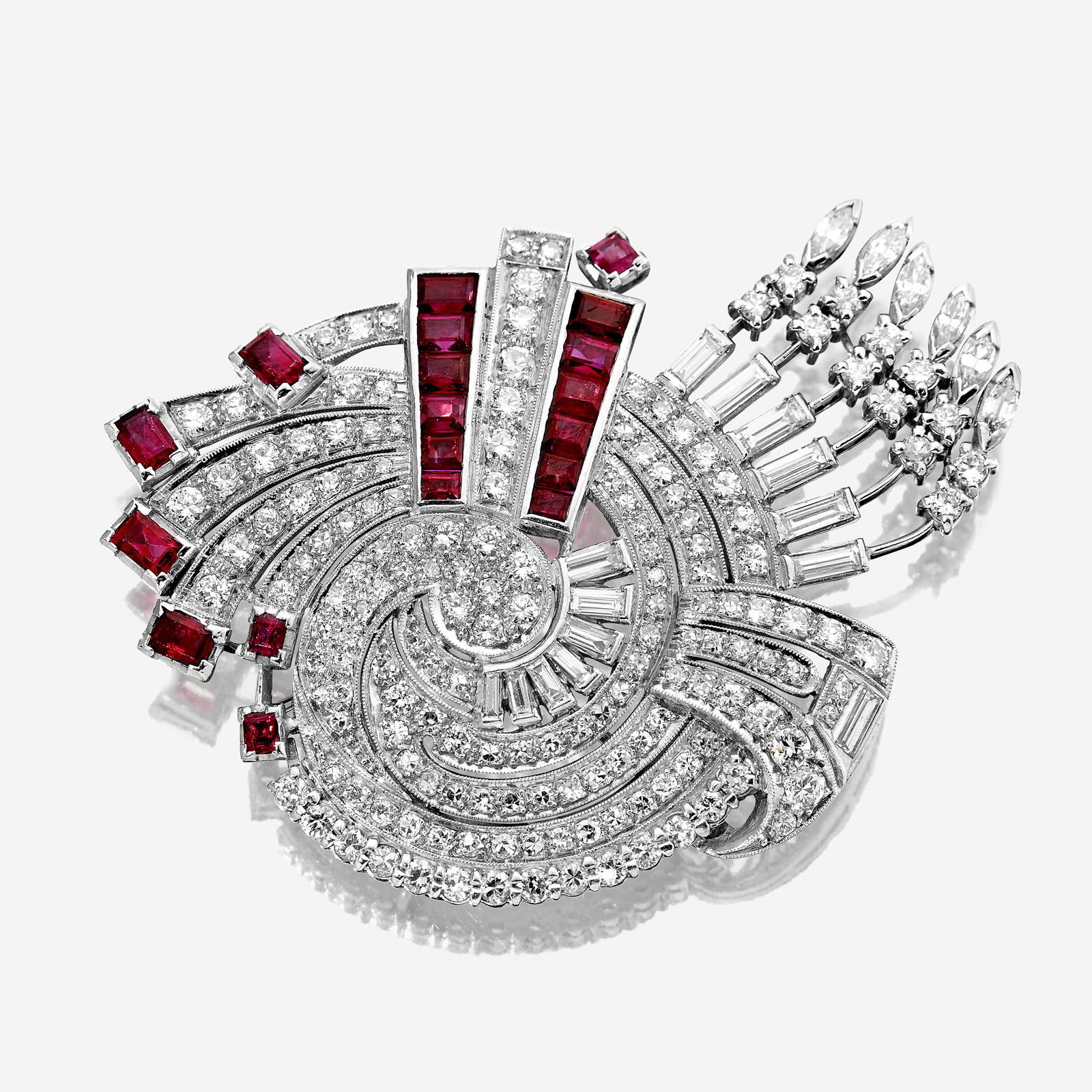 SoldA ruby, diamond, and platinum brooch,A ruby, diamond, and platinum brooch designed as an articulated cluster of rubies, surmounted by straight baguette, round, and pear-shaped diamonds; estimated total diamond weight: 7.00 carats. LengthSee Sold Price