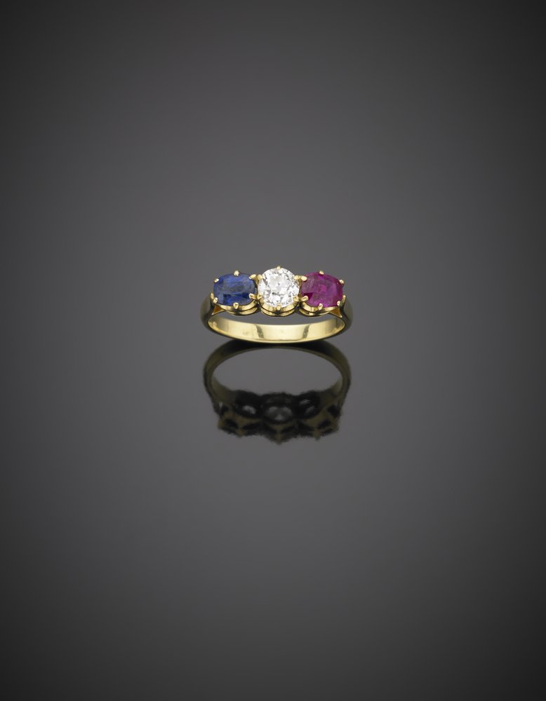 A diamond, ruby and sapphire gold ring g. 3,50 size