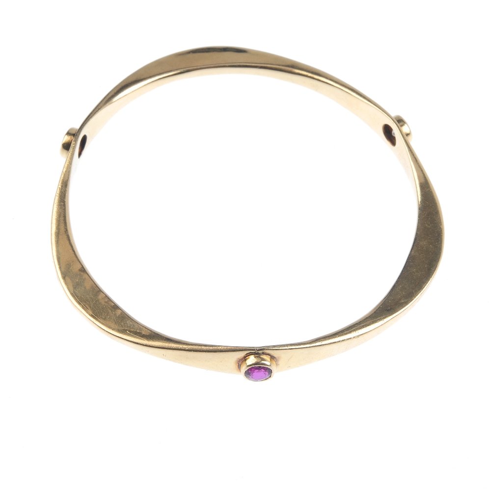 A diamond, sapphire and ruby bangle. Of triangular