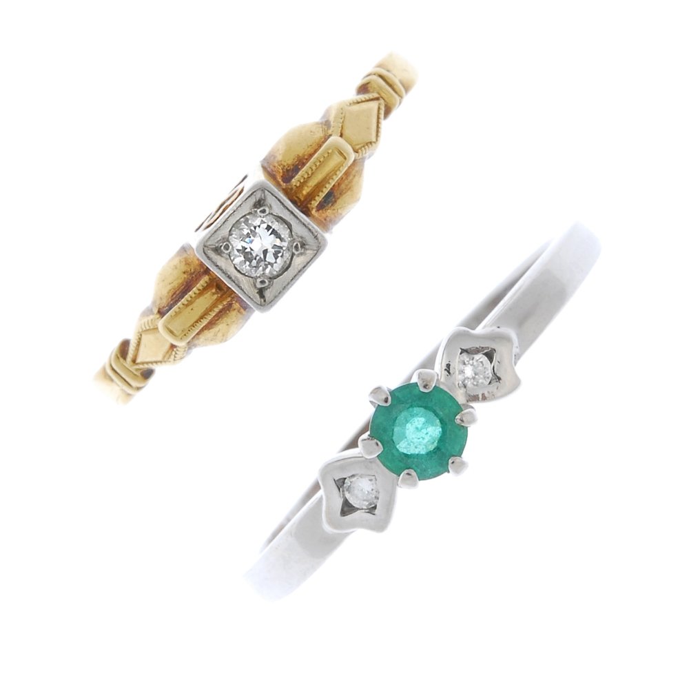 A diamond single-stone ring and an emerald and diamond