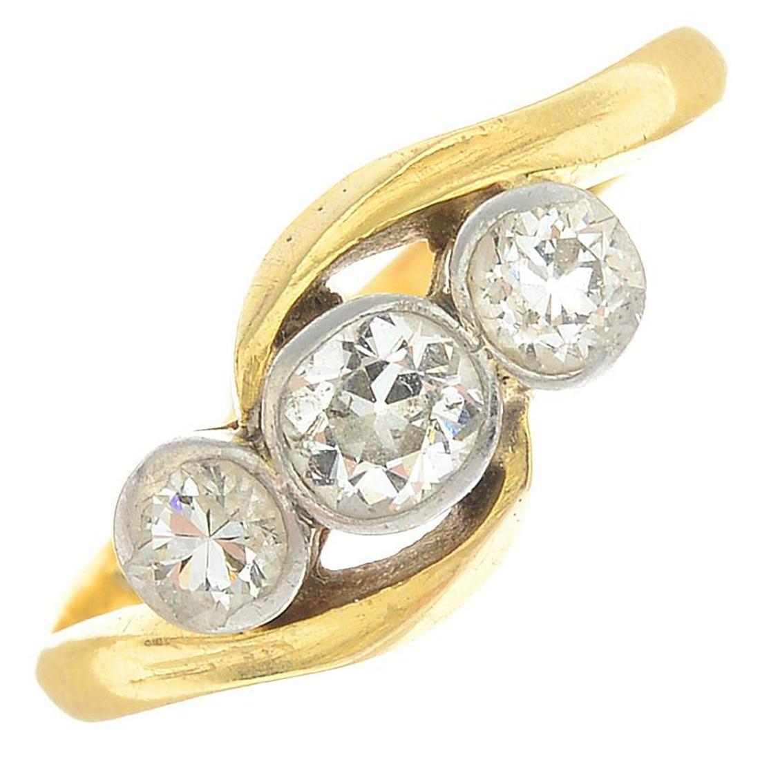 A diamond three-stone crossover ring.Estimated total