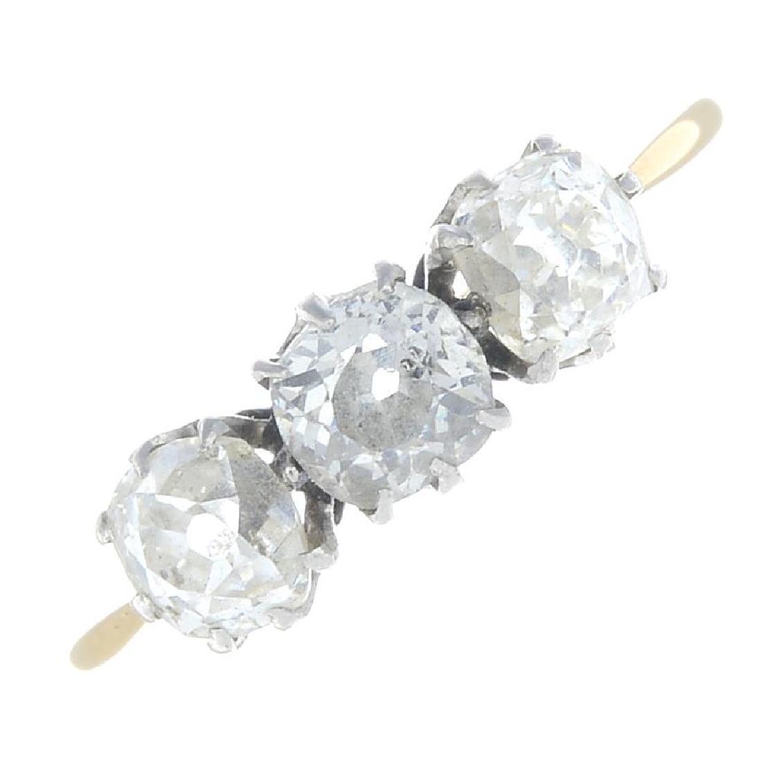 A diamond three-stone ring. Designed as old-cut diamond