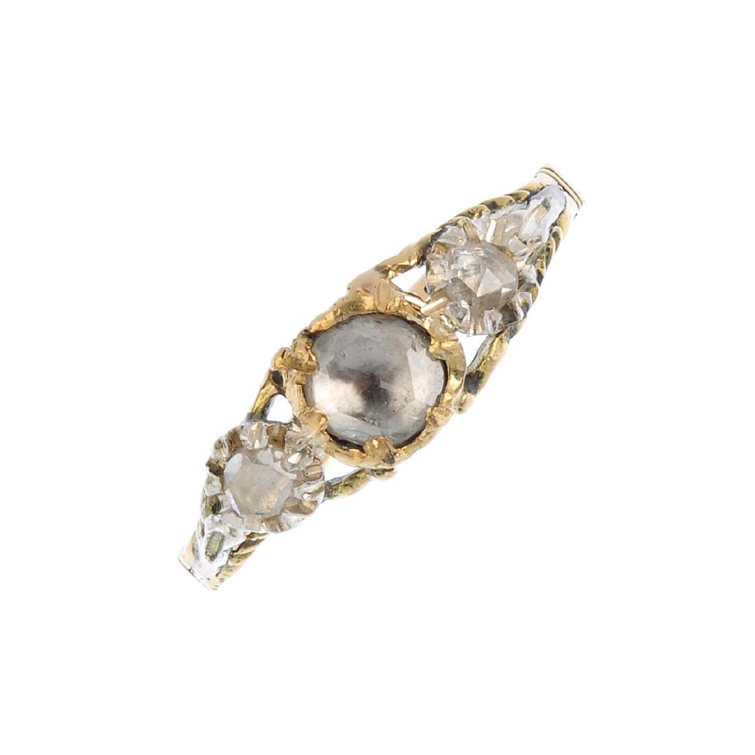 A diamond three-stone ring. The graduated rose-cut