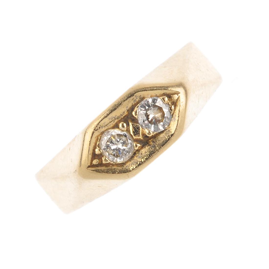 A diamond two-stone ring. The circular-cut diamond