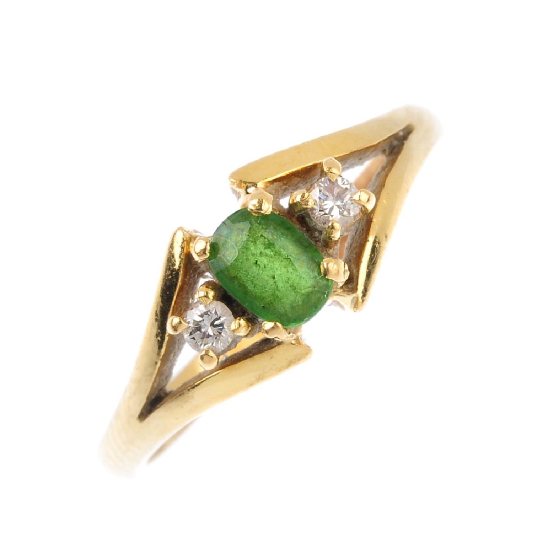 A diamonds and gem-set three-stone ring. The oval-shape