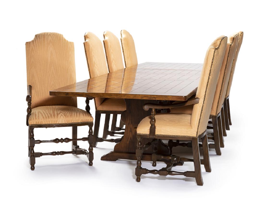 SoldVLADAMIR KAGAN: DINING TABLE & CHAIRScomprising a dining table, with label "Handmade in the Workshops of Vladimir Kagan / Vladimir Kagan Designs - New York' (58 inches wide closed; 40 inches deep; 29 1/4 inches high ); eight brown mohairSee Sold Price