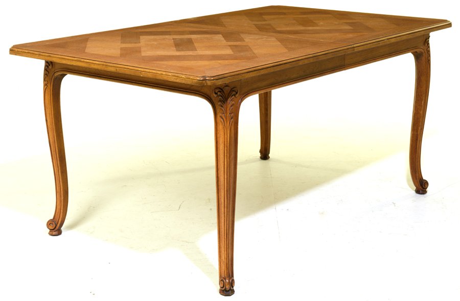 SoldFrench Provincial Style Walnut Dining TableContinental, late 20th century. A walnut French Provincial style dining table, having a rectangular, parquetry inlaid top, resting on a shaped trestle base. Apparently unmarked. Approximate height 31"See Sold Price