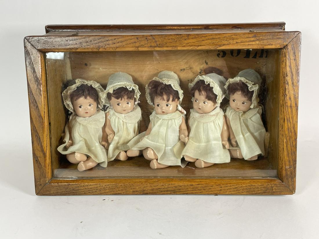 SoldMadame Alexander Dionne Quintuplets Doll SetAn antique set of five 8" dolls modeled after the Dionne Quintuplets girls. They were the first known set of quintuplets to survive infancy. They were born in 1934 in Ontario. The dolls are wearing coSee Sold Price