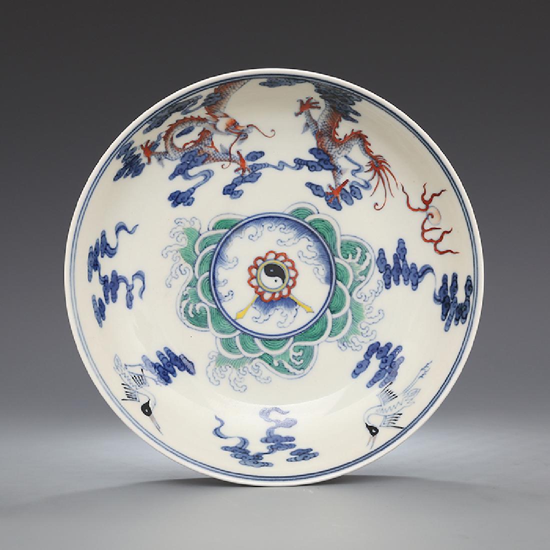 A DOUCAI DRAGON PLATEA DOUCAI DRAGON PLATE Dimension: Width: 19.5cm (7 11/16 in.), Height: 4.5cm (1 3/4 in.) All measurements are approximate. This Doucai dragon plate features a detailed design of a dragon soaring amongSee Sold Price