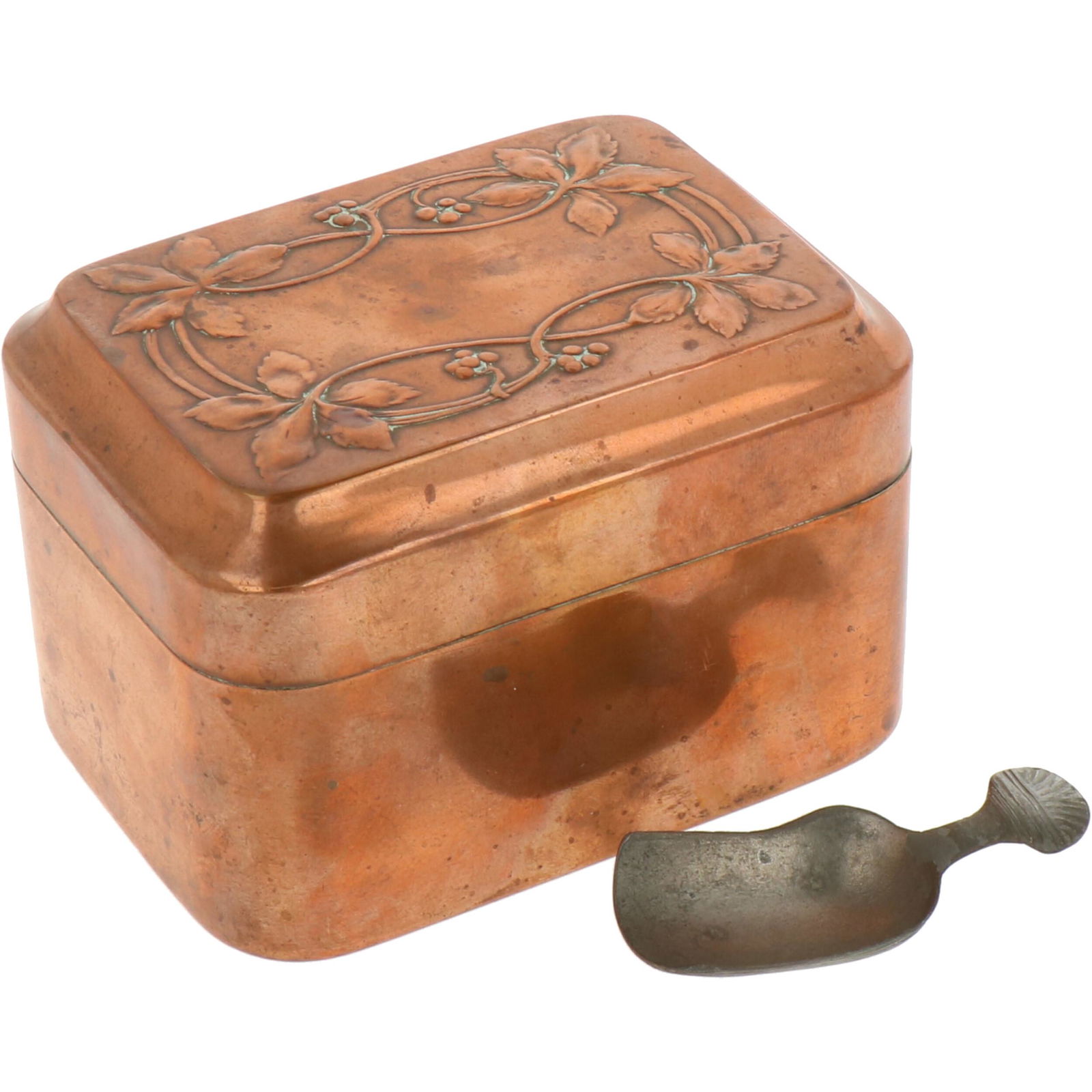 A driven copper tea caddy with pewter scoop. Late 19th