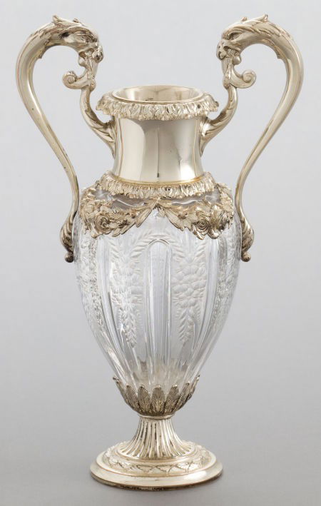 A DURGIN SILVER AND CUT GLASS TWO-HANDLED VASE