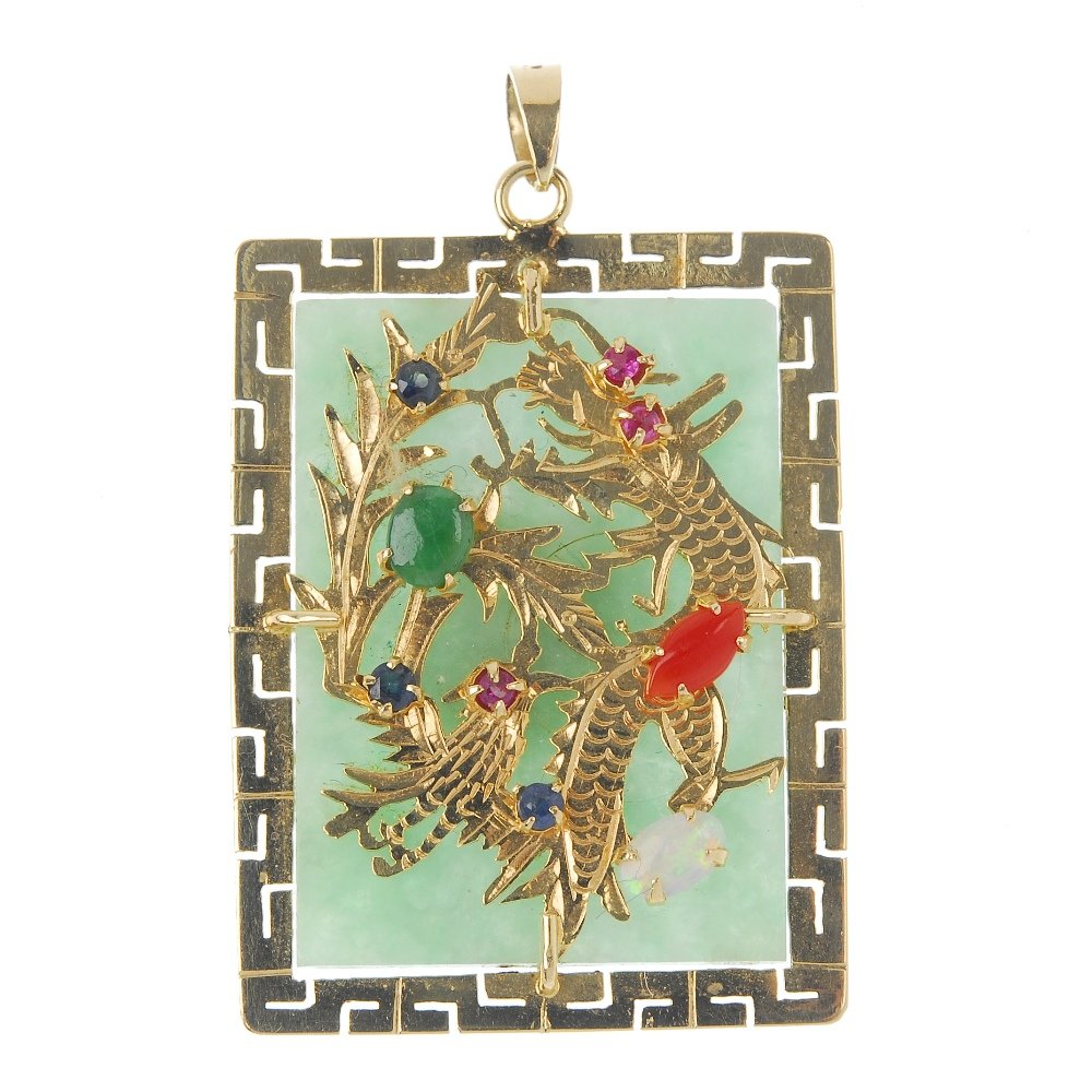 A dyed jade and gem-set pendant.