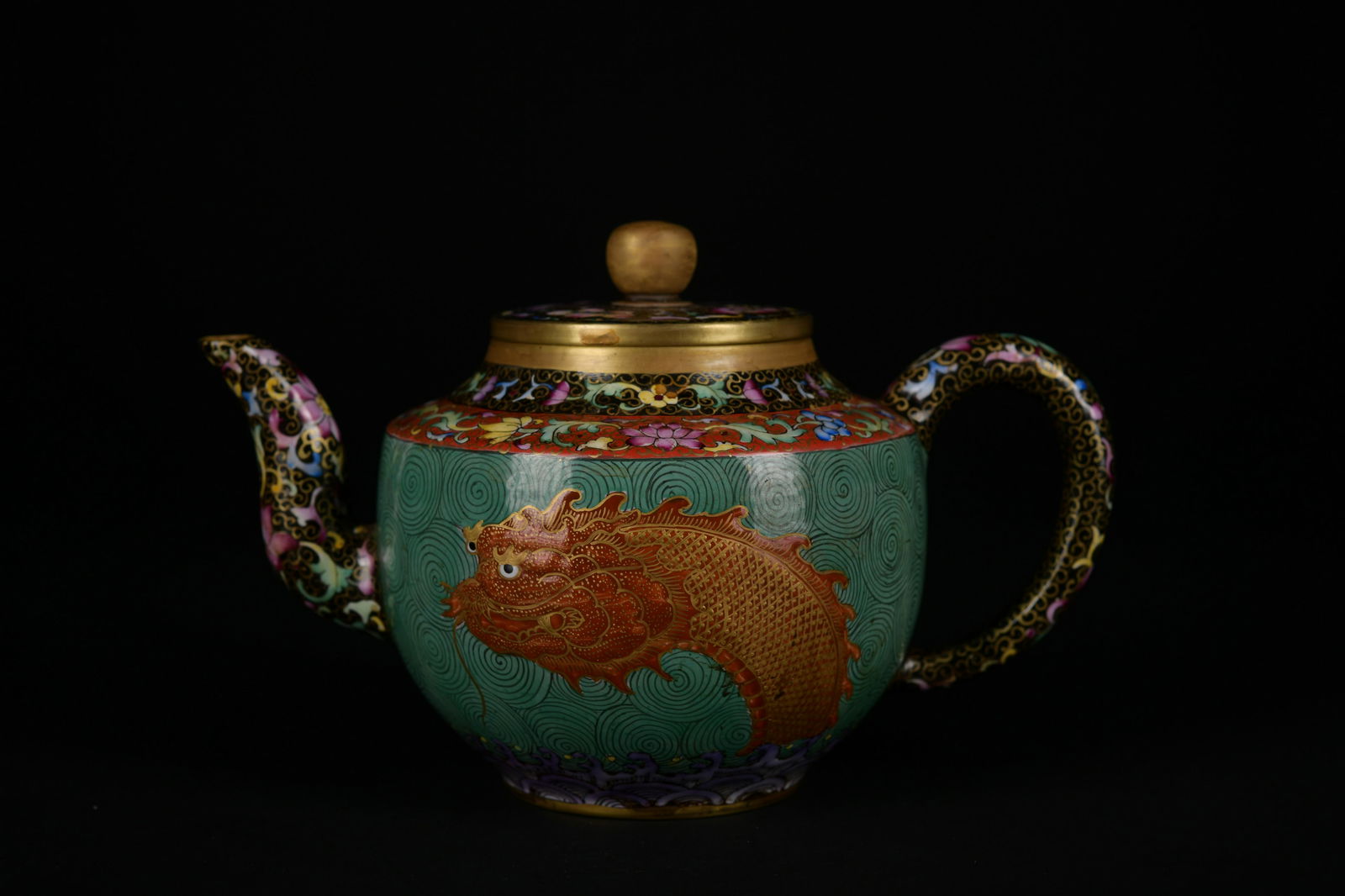 SoldCHINESE YIXING ZISHA CLAY ENAMEL DRAGON TEA POTCHINESE YIXING ZISHA CLAY ENAMEL DRAGON TEA POT. H. 14.4 cm. W. 23.5 cm by 14.5 cm. Weight 789.1 gram. Domestic shipping $30 and oversea $100. Combined shipping available, Pick-up available in our NJSee Sold Price