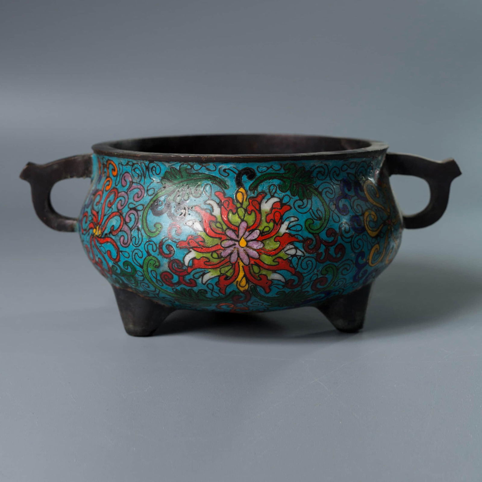 Cloisonne enamel incense burner with lotus scroll design on a copper body and pointed handles.FC4.1(4)£7006 days Left