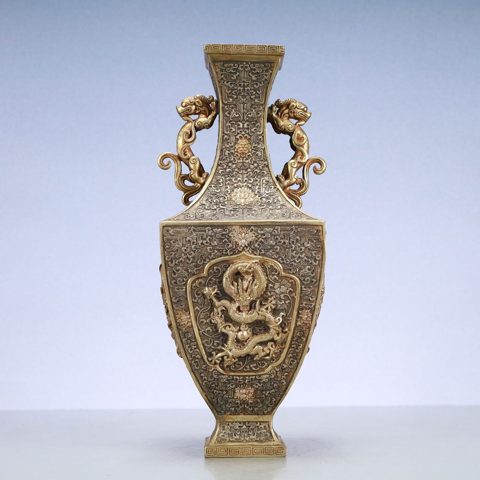 A Exquisite Gilt Silver Lotus Pattern Dragon Pattern Double-Ears Vase
