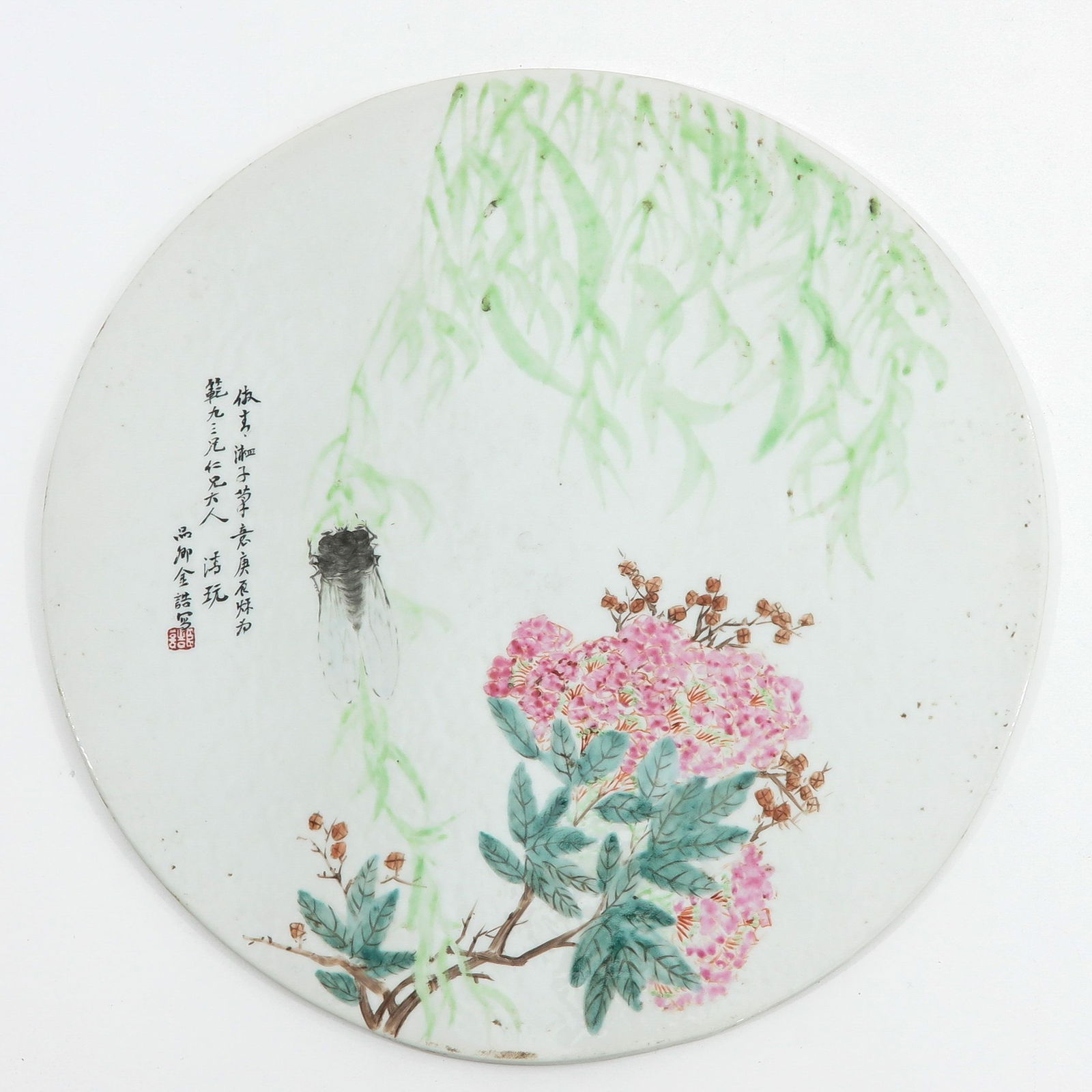 CHINESE FAMILLE ROSE PORCELAIN TILE PAINTING Late 19th/Early 20th Century 14.5" x 9.5" sight. FramedCHINESE FAMILLE ROSE PORCELAIN TILE PAINTINGLate 19th/Early 20th CenturyRiver landscape with wisteria, pavilion and boats. Calligraphy upper right. Housed in a rosewood frame.14.5" x 9.5" sight. Frame