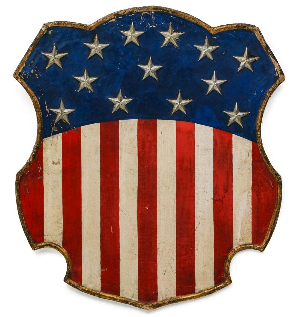 Sold19th Century FOLK ART AMERICAN FLAG ON SHIELDWonderful late 19th century plaster on wood Folk Art Flag on Shield. Flag has 13 Stars. Looks to be all original condition. Has some wear mostly on edges. No signature found. 31"x24" Very GoodSee Sold Price