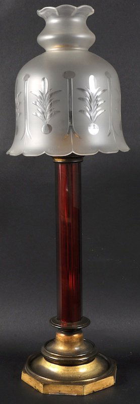 A FINE 19TH CENTURY HEXAGONAL RUBY GLASS LAMP with etch
