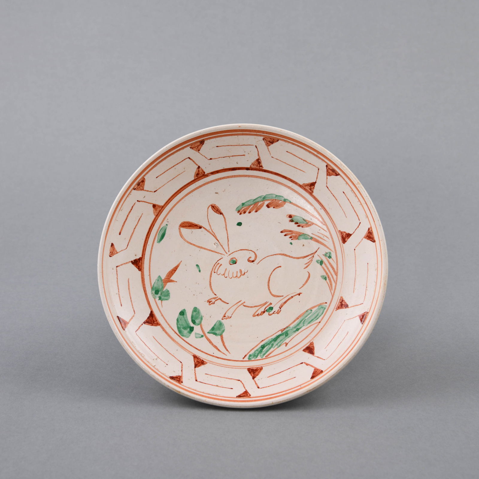A FINE PAINTED RED AND GREEN 'HARE' DISH