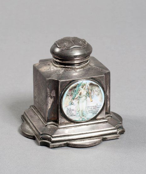 A fine quality silver inkpot mounted with two ename