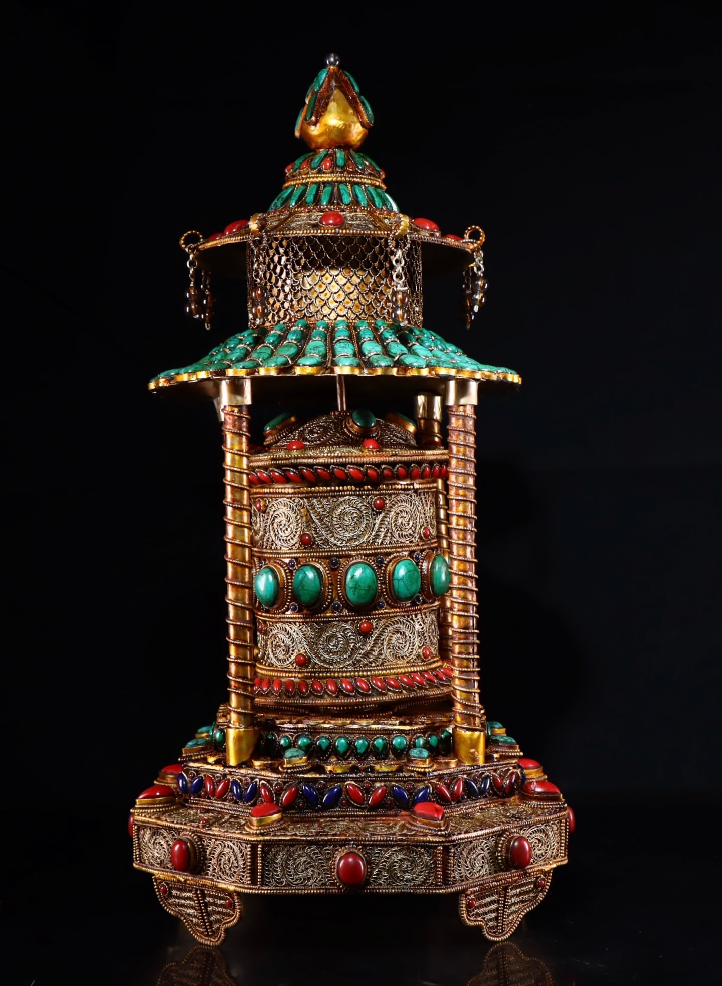 A Exquisite Silver Chiseled Cloisonne Gem-Inlaid Prayer Wheel