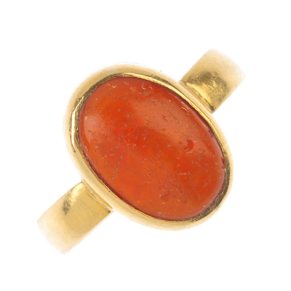 A fire-opal single-stone ring. The oval fire opal