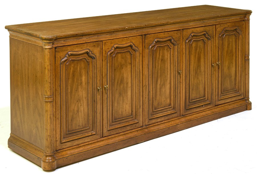 SoldFRENCH WALNUT FIVE DOOR MARBLE TOP SIDEBOARDFrench walnut five door marble top sideboard having a variegated shaped marble top. Ht: 44.25" Wd: 101.75" Dpth: 25.25"See Sold Price