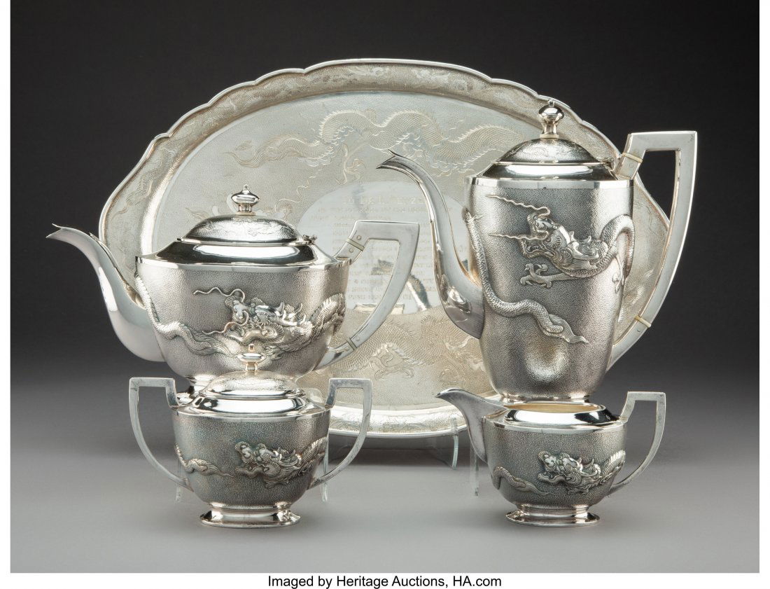 ENGLISH SILVER LUSTRE CERAMIC TEA AND COFFEE ARTICLES, LOT OF SIXMar 04, 2026BOIN-TABURET, FABERGE - 8pc. FRENCH ANTIQUE 950 STERLING SILVER TEA SET + 6 FABERGE ESPRESSO CUPS !Three silver articlesMar 03, 2026Wilhelm BINDER. 6-piece tea and coffee set in Queen Anne style. 925, 835 and 800 silver.5 days LeftE.G. WEBSTER & SON SILVER-PLATED FIVE-PIECE COFFEE AND TEA SERVICEMar 04, 2026Rococo Style Silver Plate Coffee And Tea Set (7-piece), C. Mid-late 20th Century3 days LeftA Silver Coffee ServiceMar 03, 2026ENGLISH SILVER LUSTRE CERAMIC TEA AND COFFEE 21-PIECE PARTIAL SETMar 04, 2026A six piece German 800 standard silver tea and coffee service, Wilhelm Binder, Schwabisch Gmund2 days LeftGerman Hand Chased Angkor .900 Silver Tea Service Set4 days Left3 pcs Vintage Silver Plated Tea Pots, incl. 5th Ave Co., Meriden & Wilcox. Very Good Condition.American Silver Four-Piece Tea and Coffee ServiceMar 14, 20263 pcs Vintage Rochester Silver Plated Tea Pots w/ Floral Details. Good Condition. See pics.Rare 7pc Reed & Barton Francis I Sterling Silver Tea Set with Kettle5 hrs Left5 Pieces Preisner Sterling Silver Tea Set with a Large Oval English Sterling Silver Tray5 days LeftFour-Piece Durgin Sterling Tea & Coffee Service3 days Left