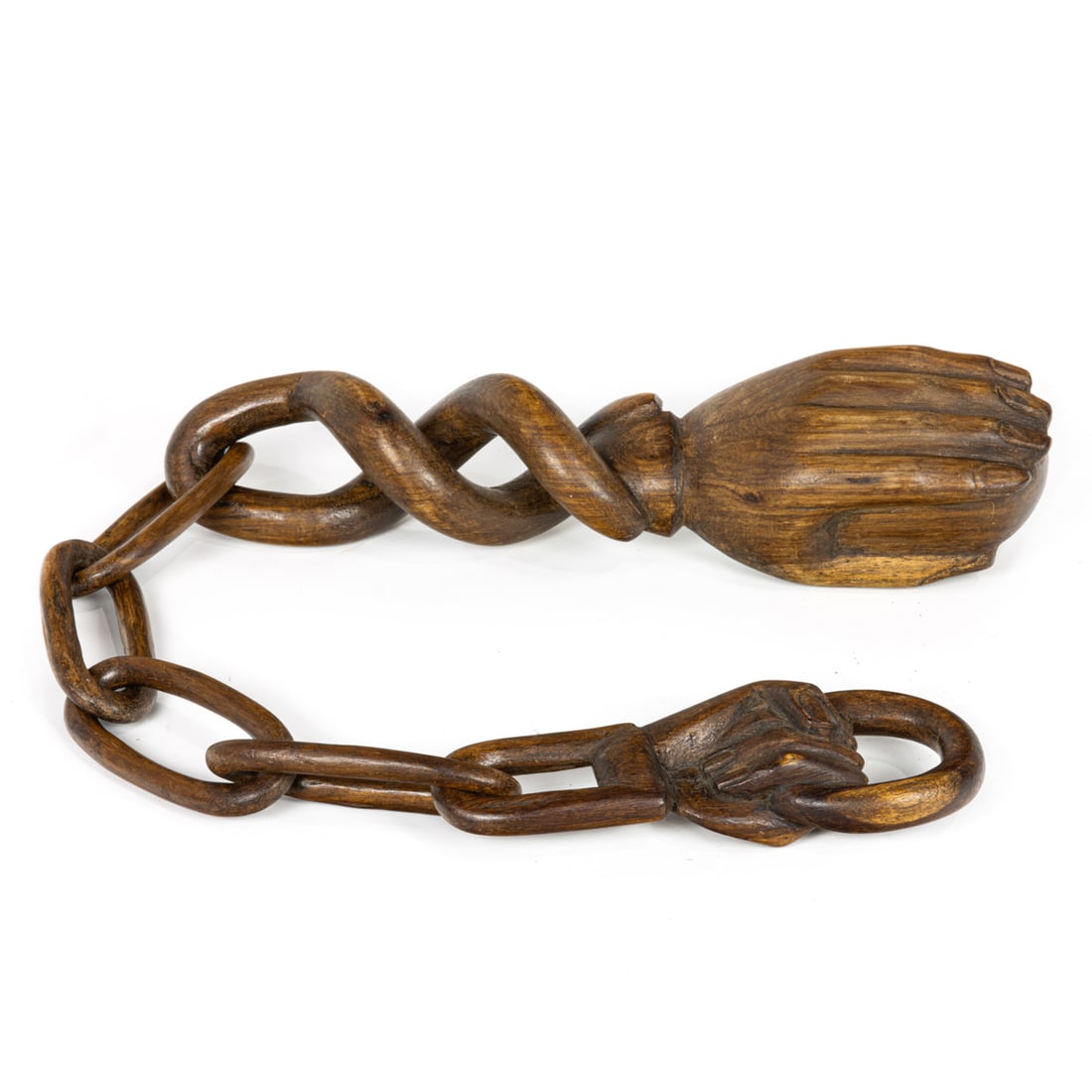 A Folk Art carved whimsy chain with two hands