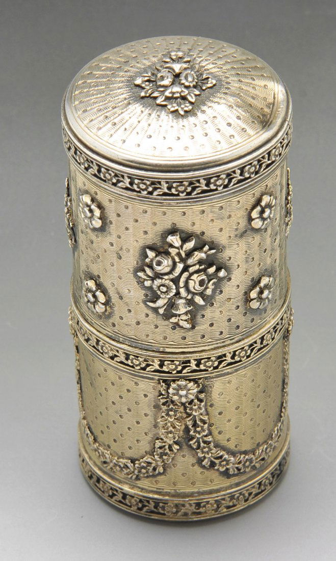SoldA FRENCH SILVER-MOUNTED SCENT BOTTLEA FRENCH SILVER-MOUNTED SCENT BOTTLE, late 19th/early 20th Century, the cylindrical glass body etched with scrollwork, the engine-turned hinged cover enclosing the original glass stopper, in a fittedSee Sold Price