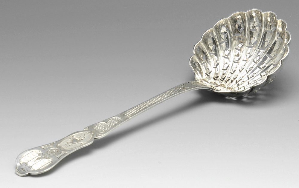 SoldA Victorian silver sifter spoon.A Victorian silver sifter spoon, the diaper pierced silver-gilt bowl to the twist stem with figurative finial. Hallmarked London 1774, maker's mark indistinct. Length measuring 6 1/2 inches (16.5 cm),See Sold Price