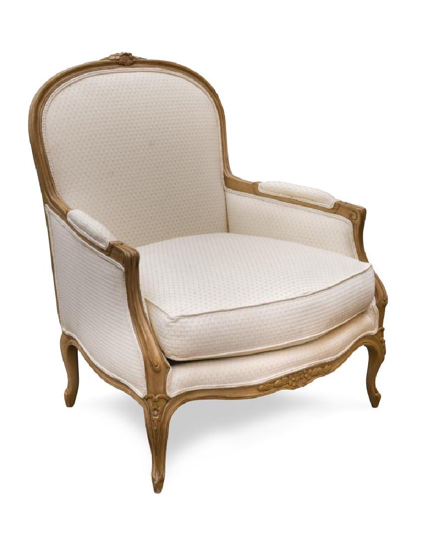 SoldFRENCH STYLE FAUTEUIL ARMCHAIRDimensions: H 39.25" x W 25.25" x D 22.5" x SH 18.5" Condition: Showing light overall wear consistent with use. Few dings and small marks.See Sold Price
