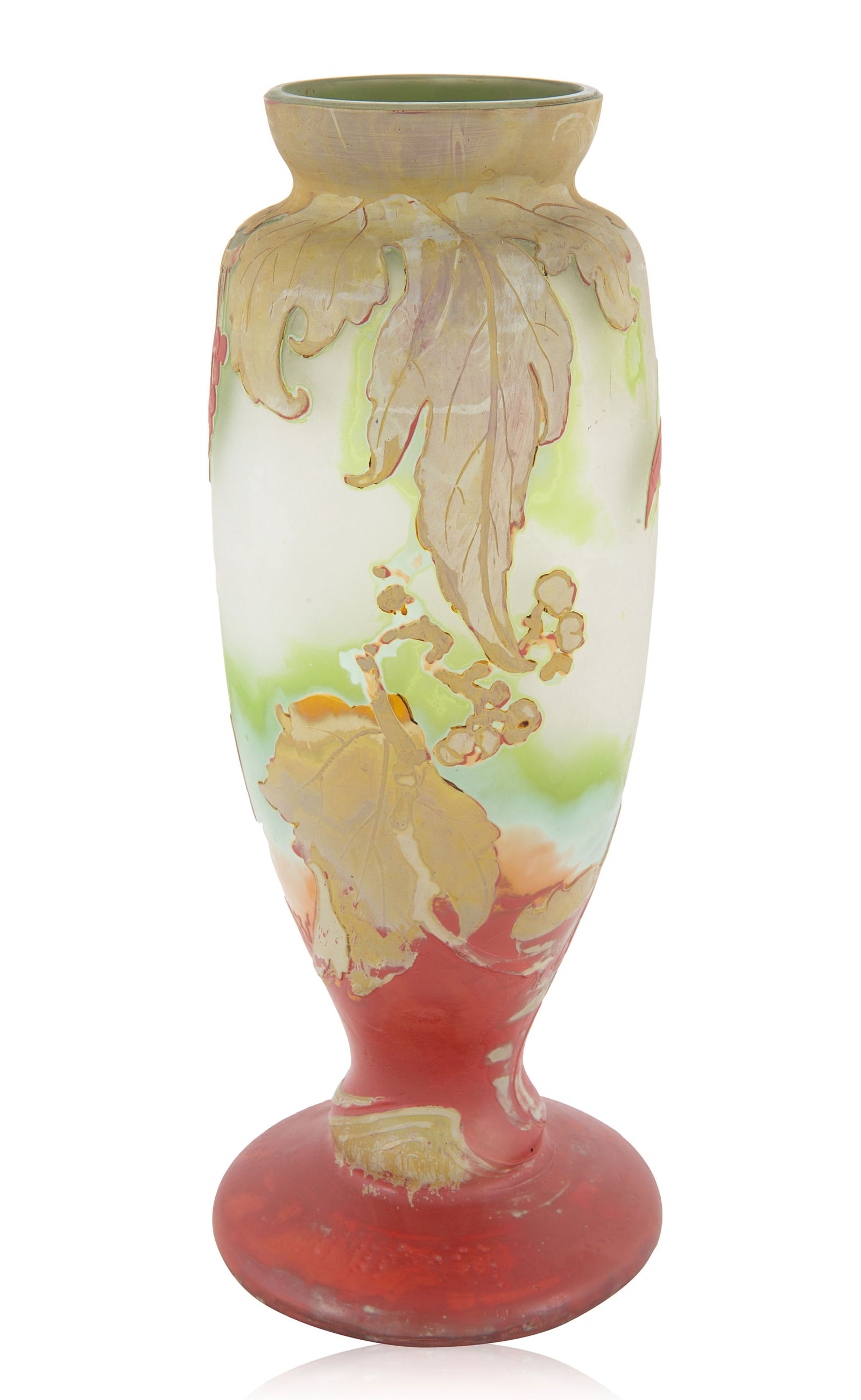 SoldLegras Cameo Glass Leaf-Decorated VaseTogether with a cameo glass vase, Galle style. 2 pieces 11-3/4"h and 14-1/4"hSee Sold Price