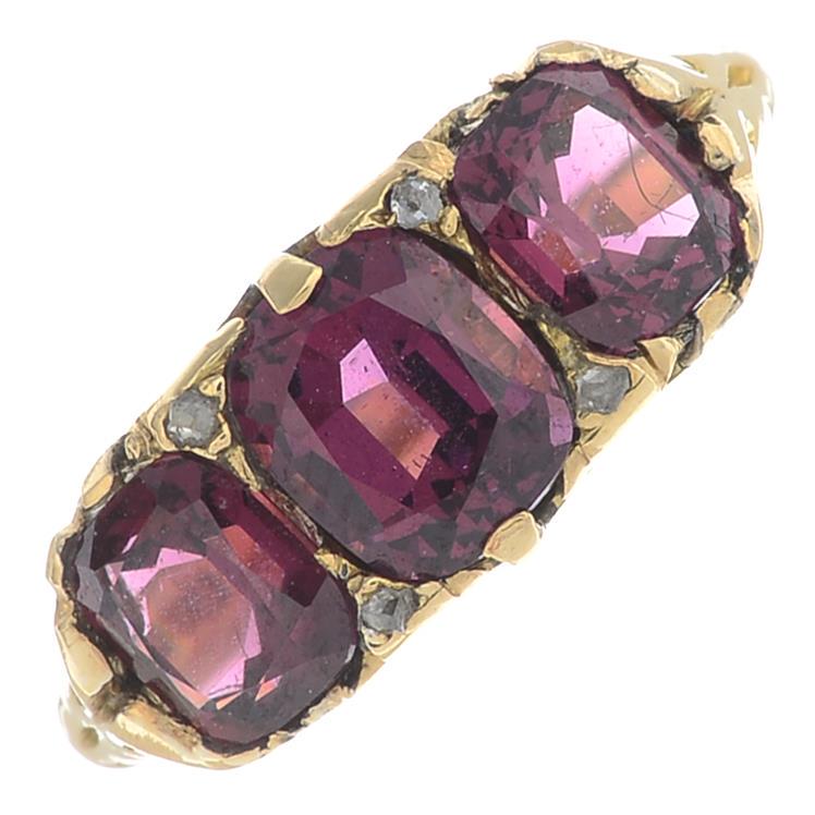 A garnet three-stone ring, with diamond spacers.Stamped