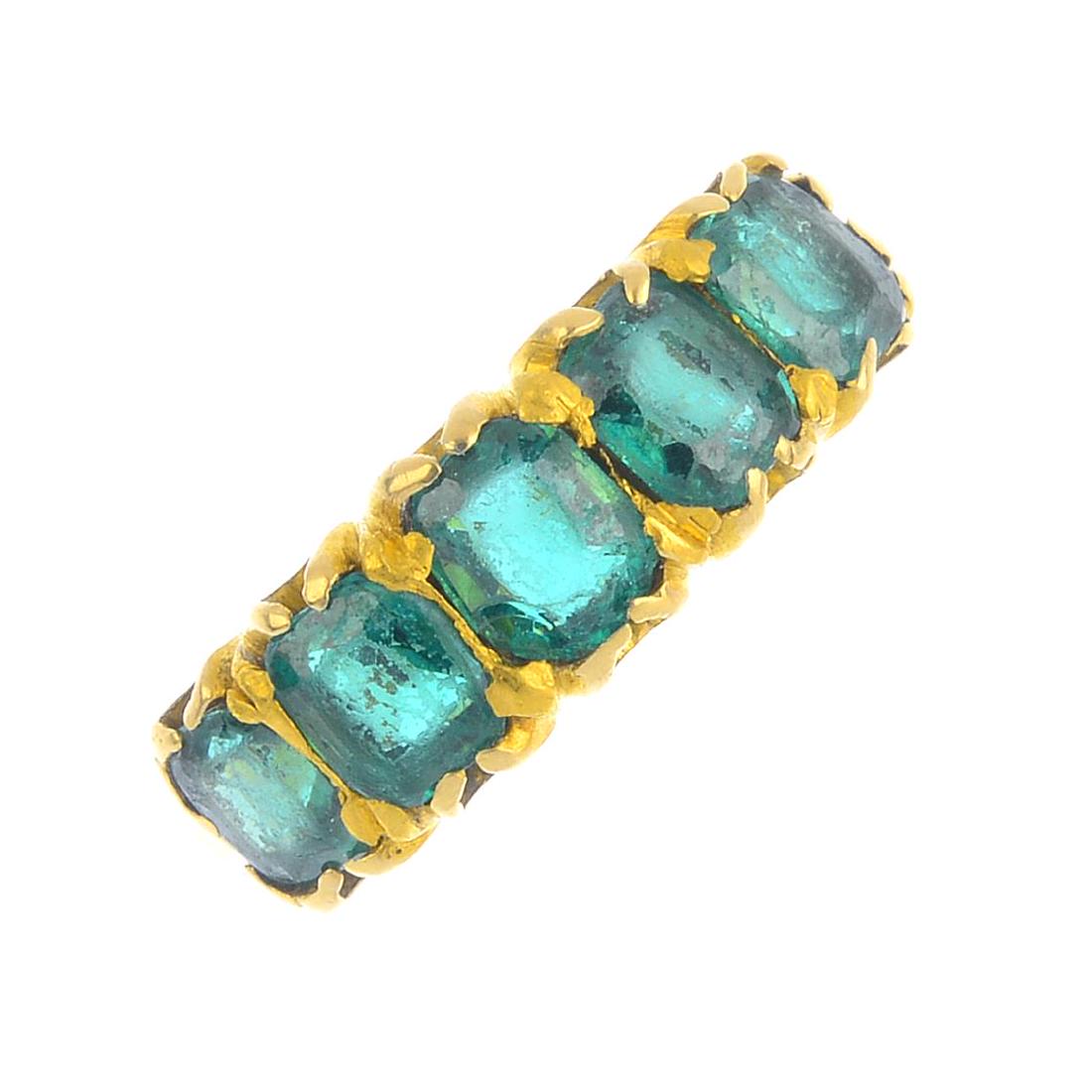 A garnet-topped-doublet five-stone ring. The graduated