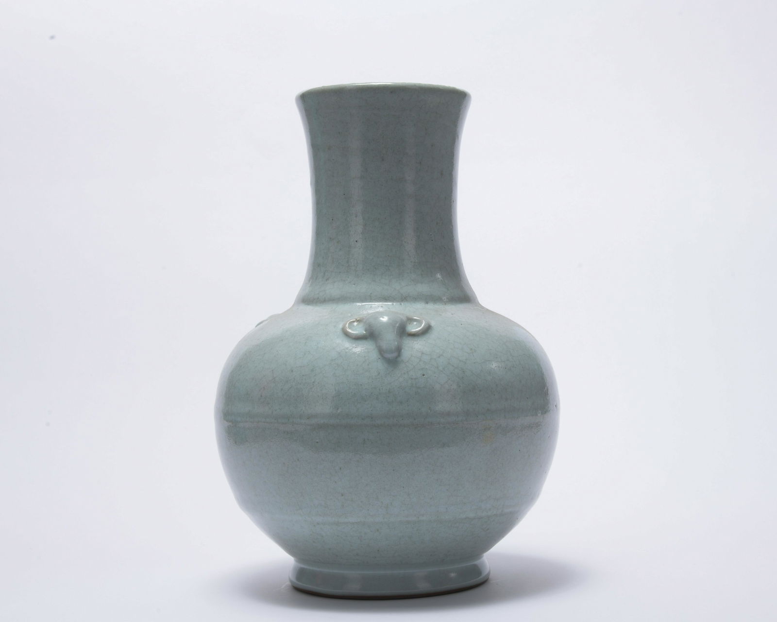 SoldA Group of Three Porcelain Vases, Qing DynastyComprising a crackled white-glazed and molded bottle vase, 12.3/8 in. (31.5 cm.) high, 6.5/8 in. (16.9 cm.) wide; a celadon-glazed Ge-type vase, 11.1/8 in. (28.3 cm.) high, 6.3/4 in. (17.2 cm.) wide;See Sold Price