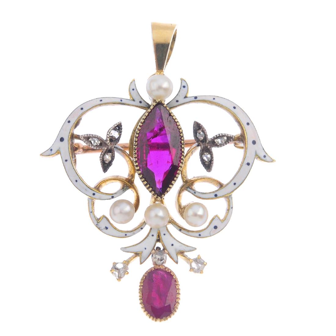 A gem-set and enamel pendant. The oval-shape ruby drop,