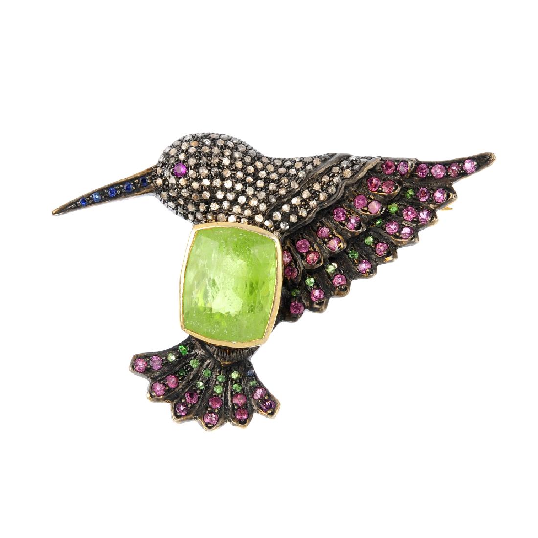 A gem-set bird brooch. The rectangular-shape peridot,