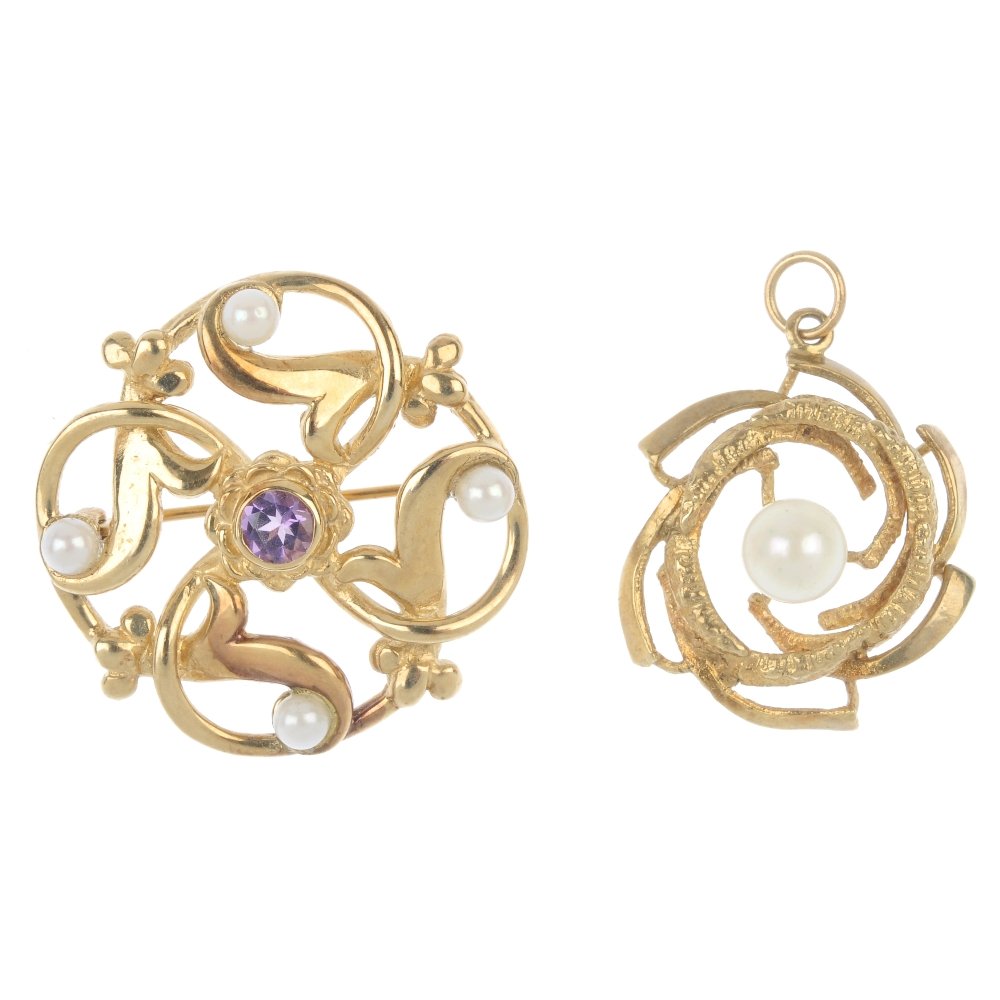 SoldAN ART NOUVEAU GOLD GEM-SET LAVALIER NECKLACE AND BROOCHAN ART NOUVEAU GOLD GEM-SET LAVALIER NECKLACE AND BROOCH The pendant set with fancy-cut amethysts, split pearls, and a circular-cut demantoid garnet, English hallmarks, the brooch designed as enamel aSee Sold Price