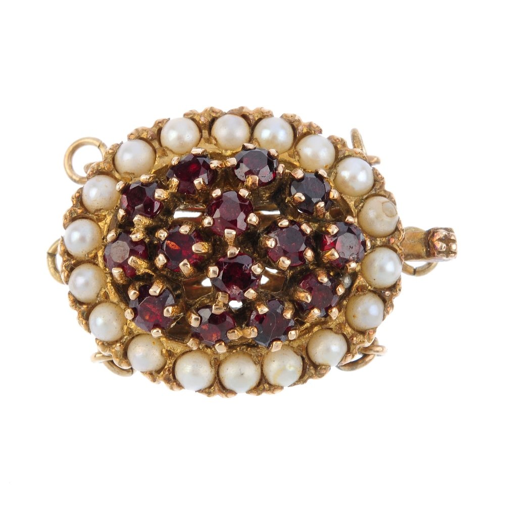 A gem-set pearl clasp. The circular-shape garnet