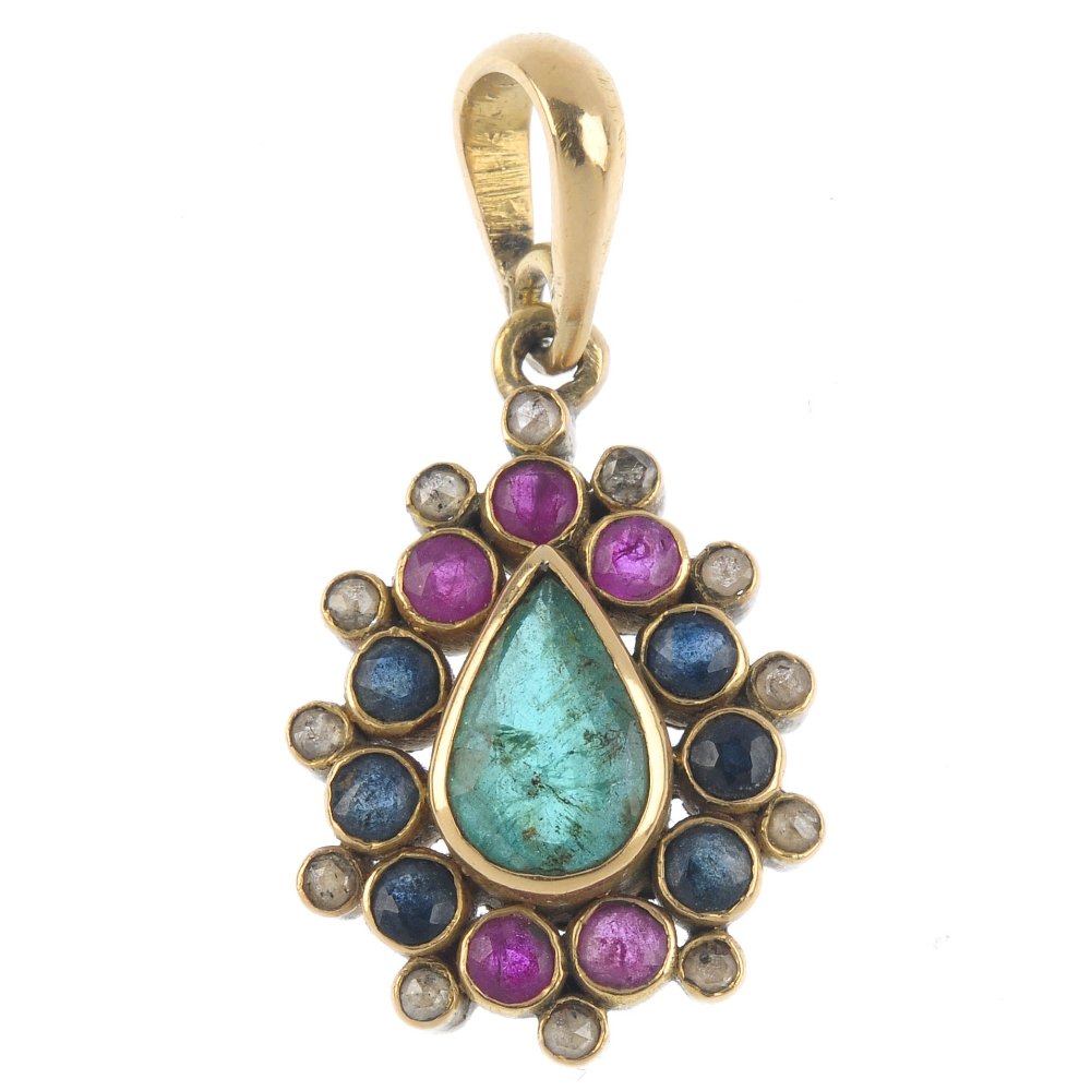 A gem-set pendant. The pear-shape emerald, within an