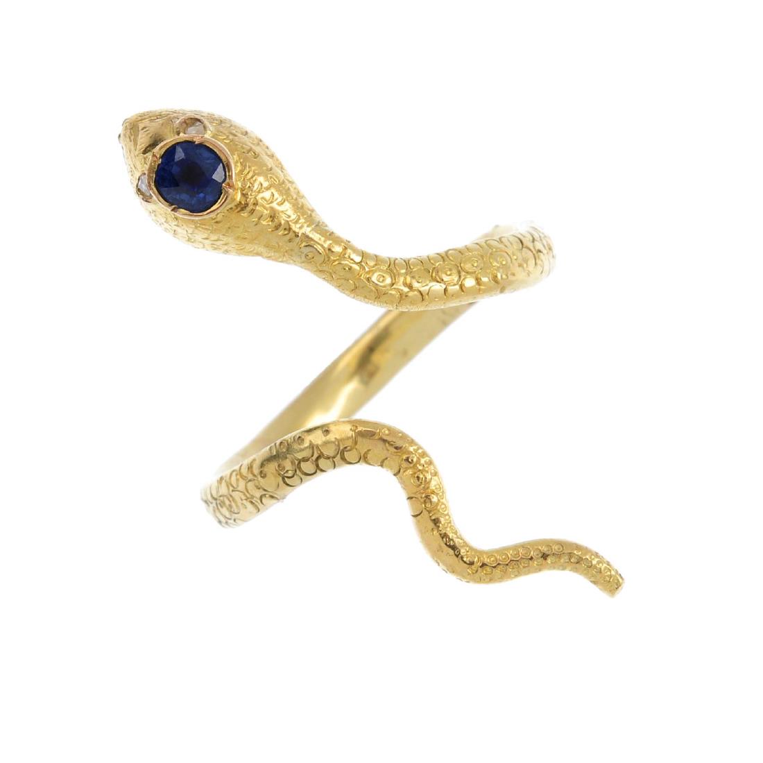 A gem-set snake ring. The open band, designed as a